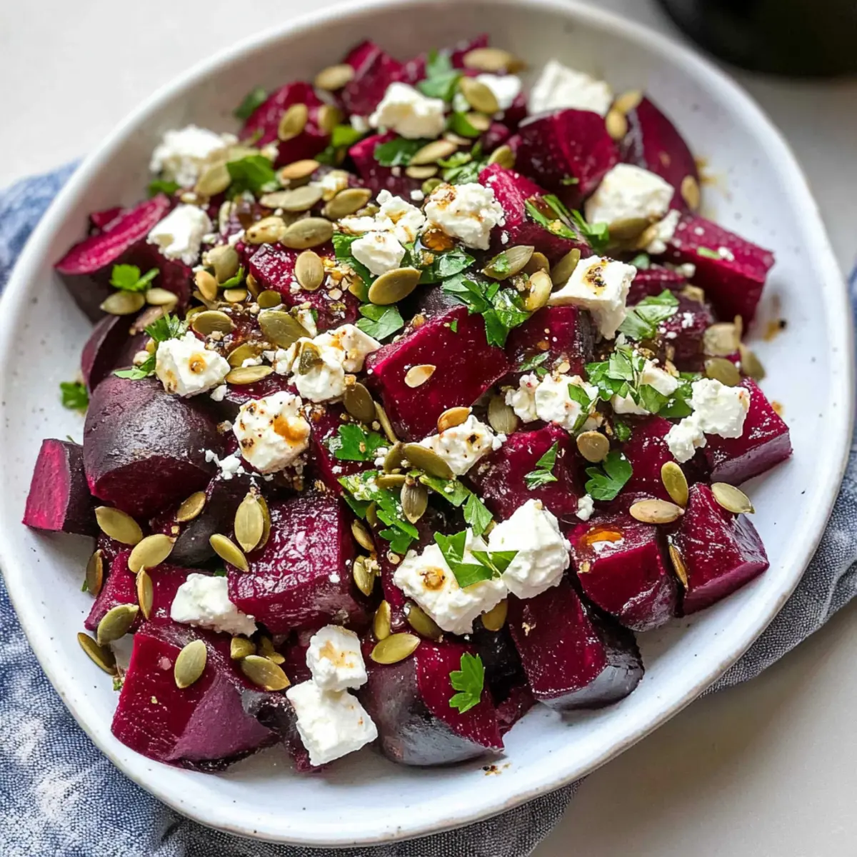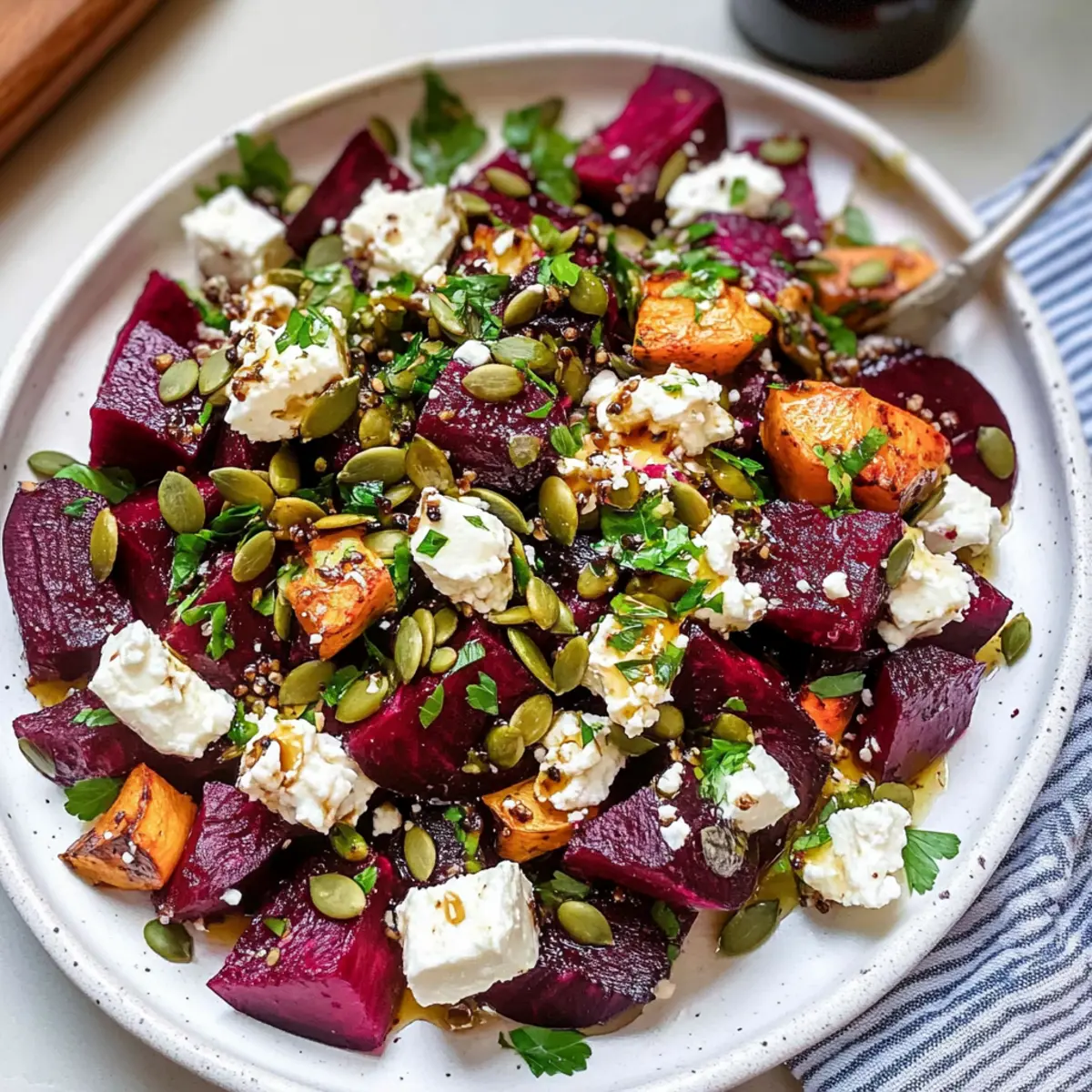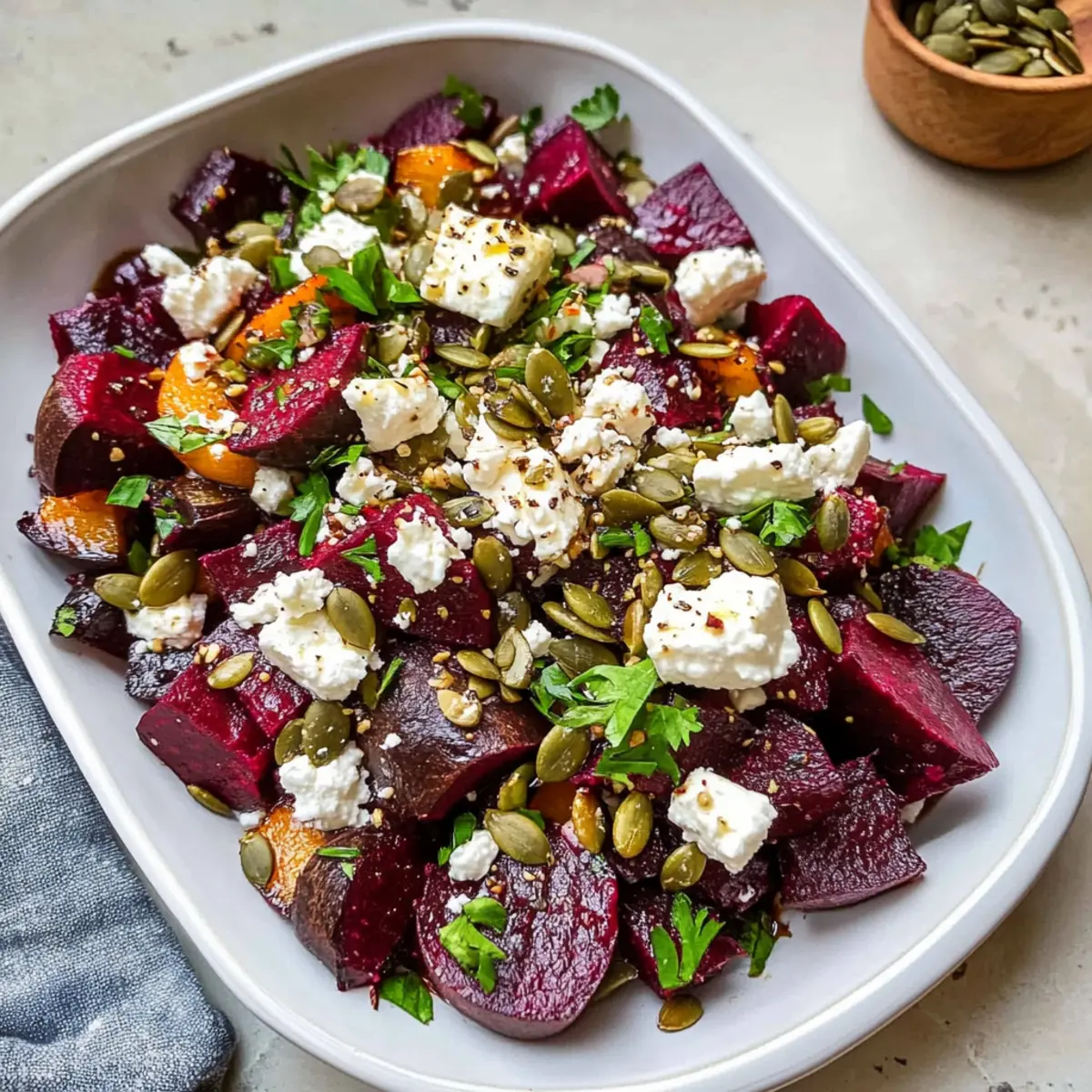 Frische Aromen: Die Kombination aus erdigen Beeten, cremigem Feta und knackigen Kürbiskernen schafft eine harmonische Geschmacksexplosion, die deine Geschmacksknospen erfreuen wird.