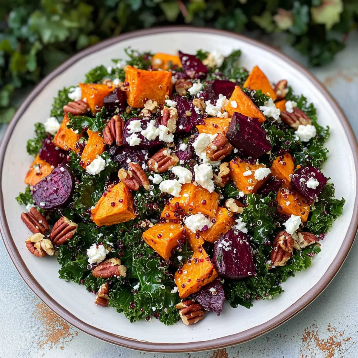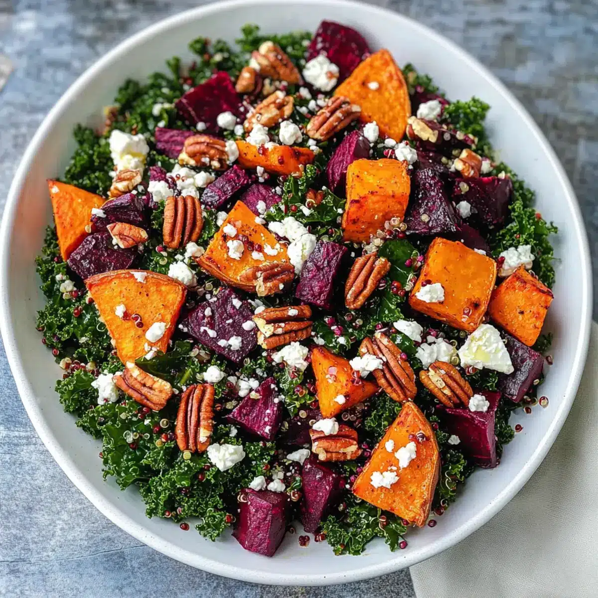 Bestreue den fertigen Salat mit Feta-Käse und Pekannüssen für zusätzlichen Crunch. Träufle das übrige Dressing über den Salat und mische alles vorsichtig, um die Aromen zu vereinen. Dieser Süßkartoffel & Rote Bete Salat ist nun bereit, serviert zu werden – frisch und voller gesunder Nährstoffe!