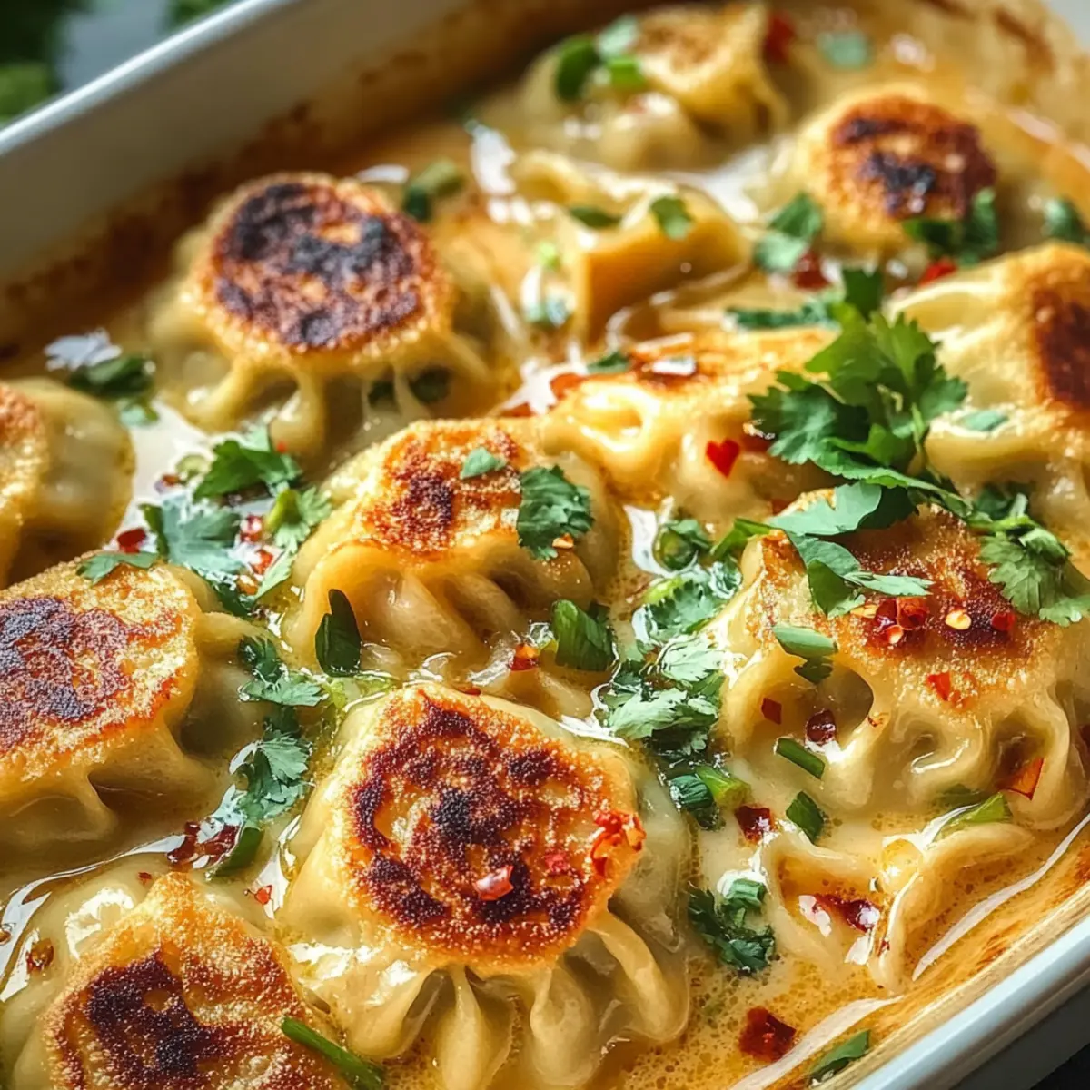 Reisnudeln: Füge vor dem Backen eine Schicht vorgekochter Reisnudeln unter die Dumplings hinzu. Dies macht das Gericht noch sättigender und gibt einen anderen Texturkick!
