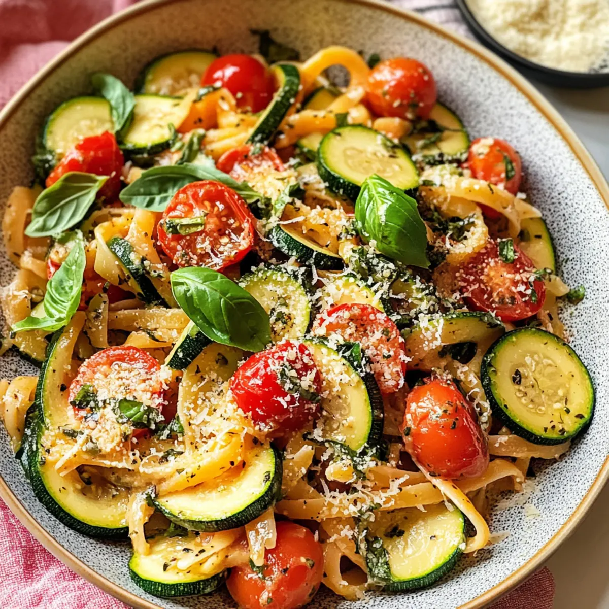Verteile die Tomaten Zucchini Pasta auf Tellern und garniere sie mit mehr frisch geriebenem Parmesan und einem zusätzlichen Zweig Basilikum, wenn gewünscht. Serviere das Gericht umgehend, damit die Aromen frisch und lecker bleiben. Optional kannst du auch einen Spritzer Olivenöl darüber geben für extra Würze!