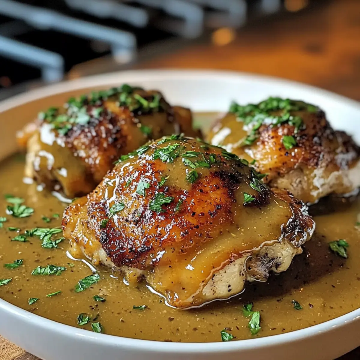 Lege die angebratenen Hähnchenschenkel wieder in die Pfanne, sodass sie in der Soße liegen. Decke die Pfanne mit einem Deckel ab und platziere sie in einem vorgeheizten Ofen bei 200 °C (400 °F). Lasse das Ganze für 45 Minuten backen, sodass das Hähnchen saftig bleibt und die Aromen sich verbinden.