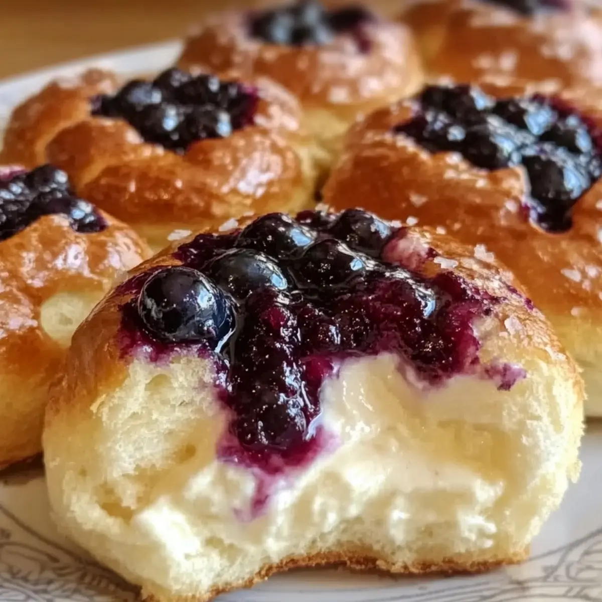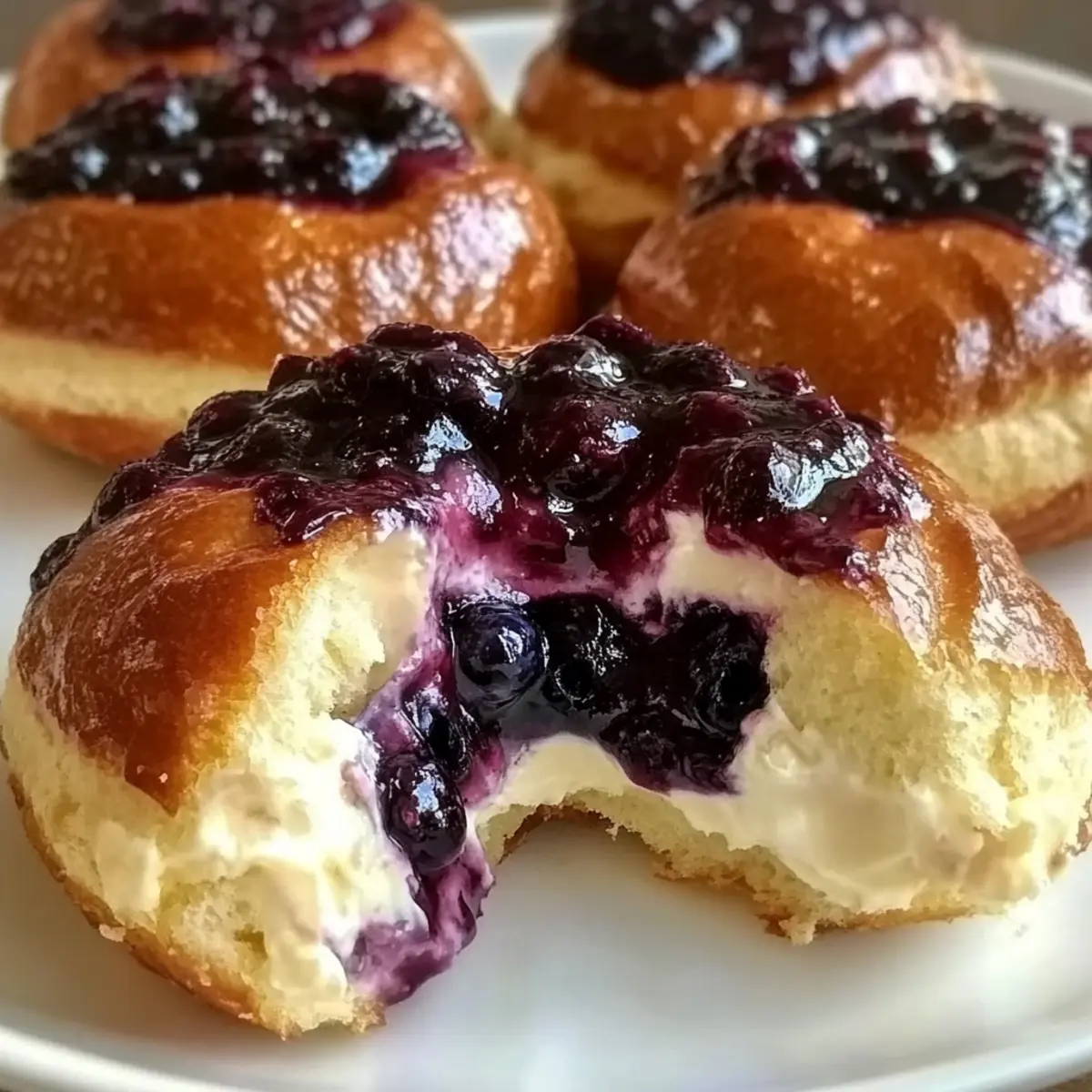 Die Käsekuchen-Füllung gleichmäßig in die Vertiefungen der geformten Brötchen löffeln. Mit dem Blaubeerkompott toppen und wenn gewünscht, einen Streuselteig als Topping hinzufügen. Achte darauf, dass der Kompott gleichmäßig verteilt ist.