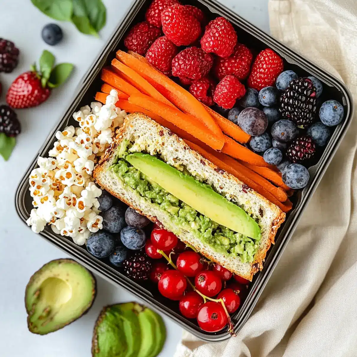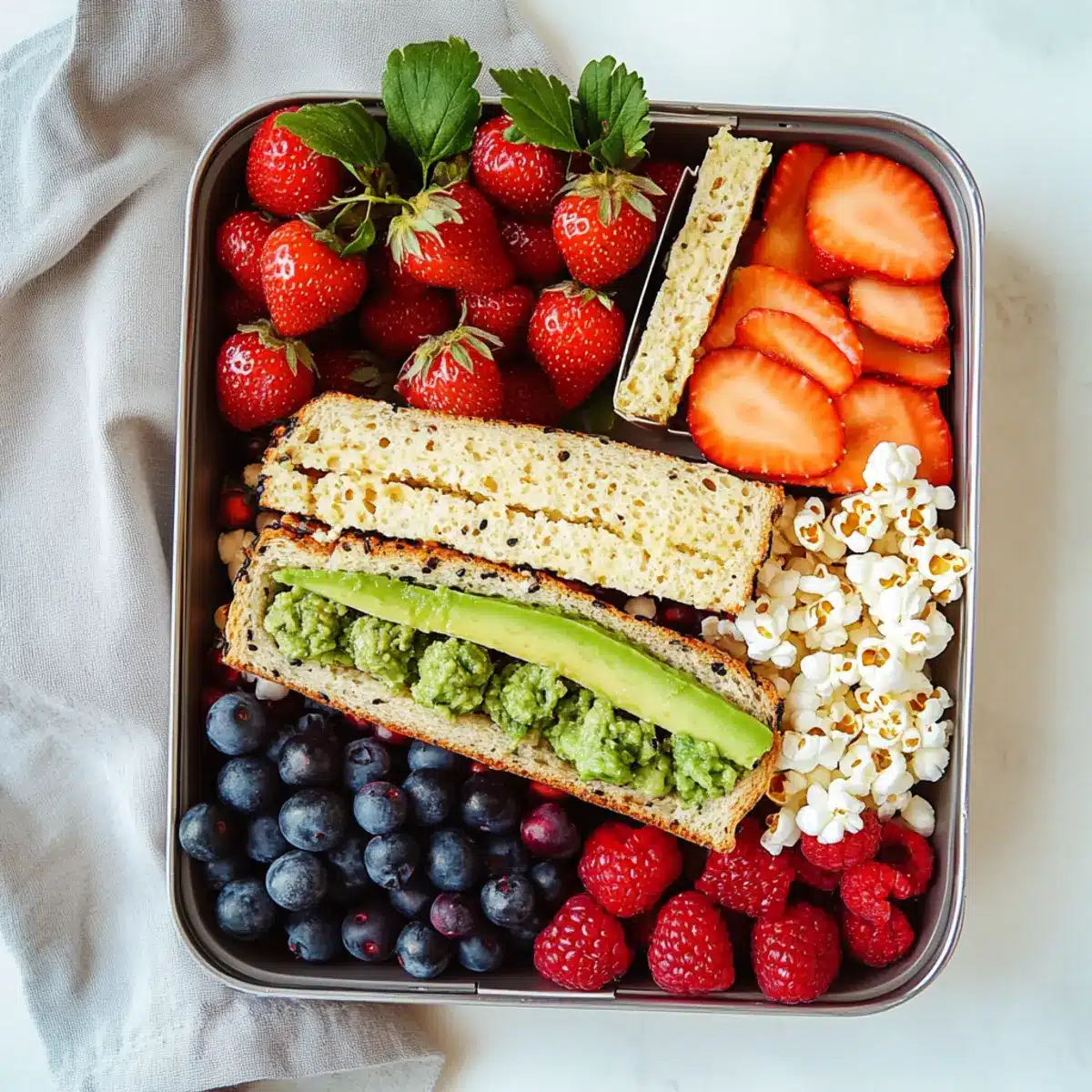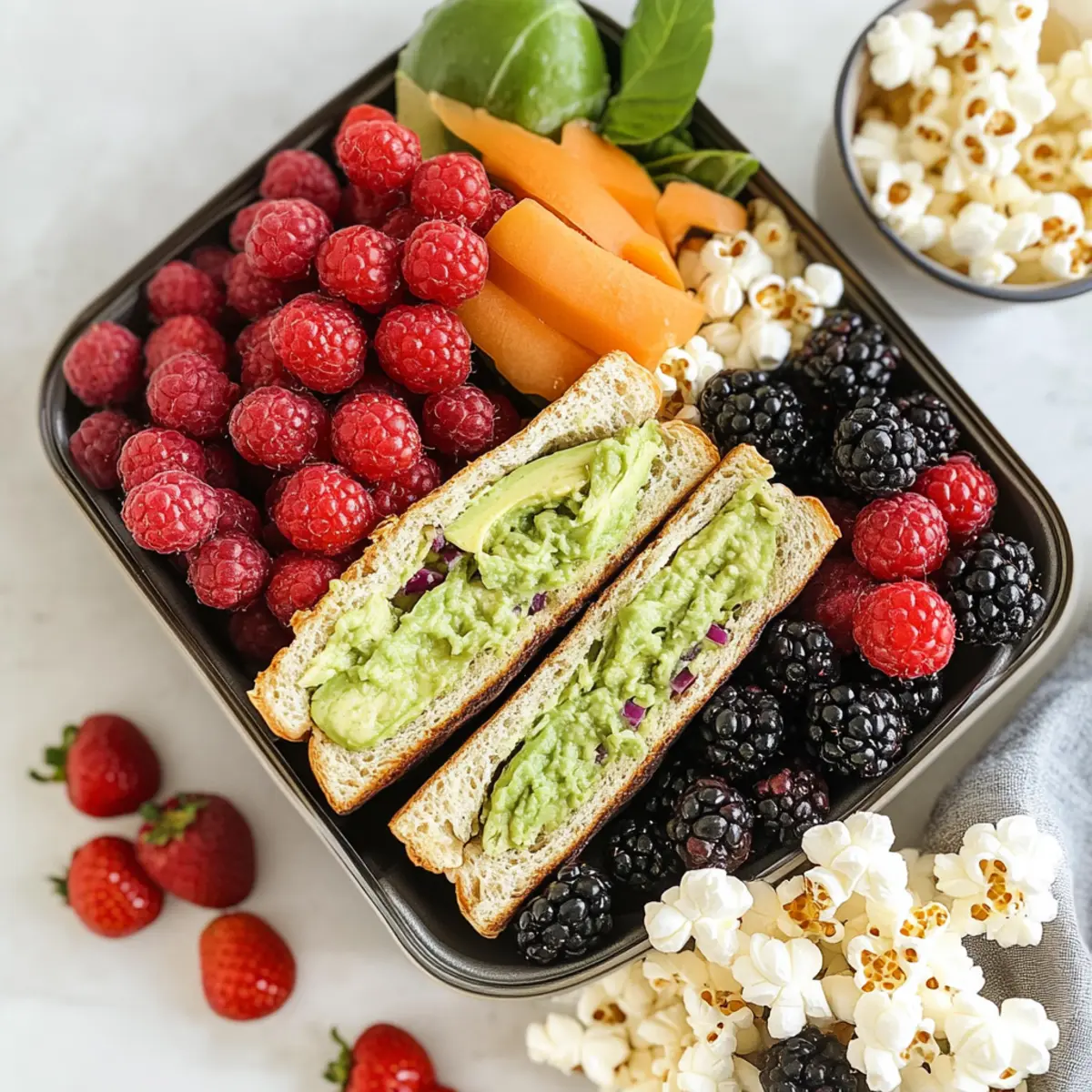 - Nehme die Bento-Box und platziere die Avocado-Sandwiches, das Popcorn und die Beeren in separaten Fächern.