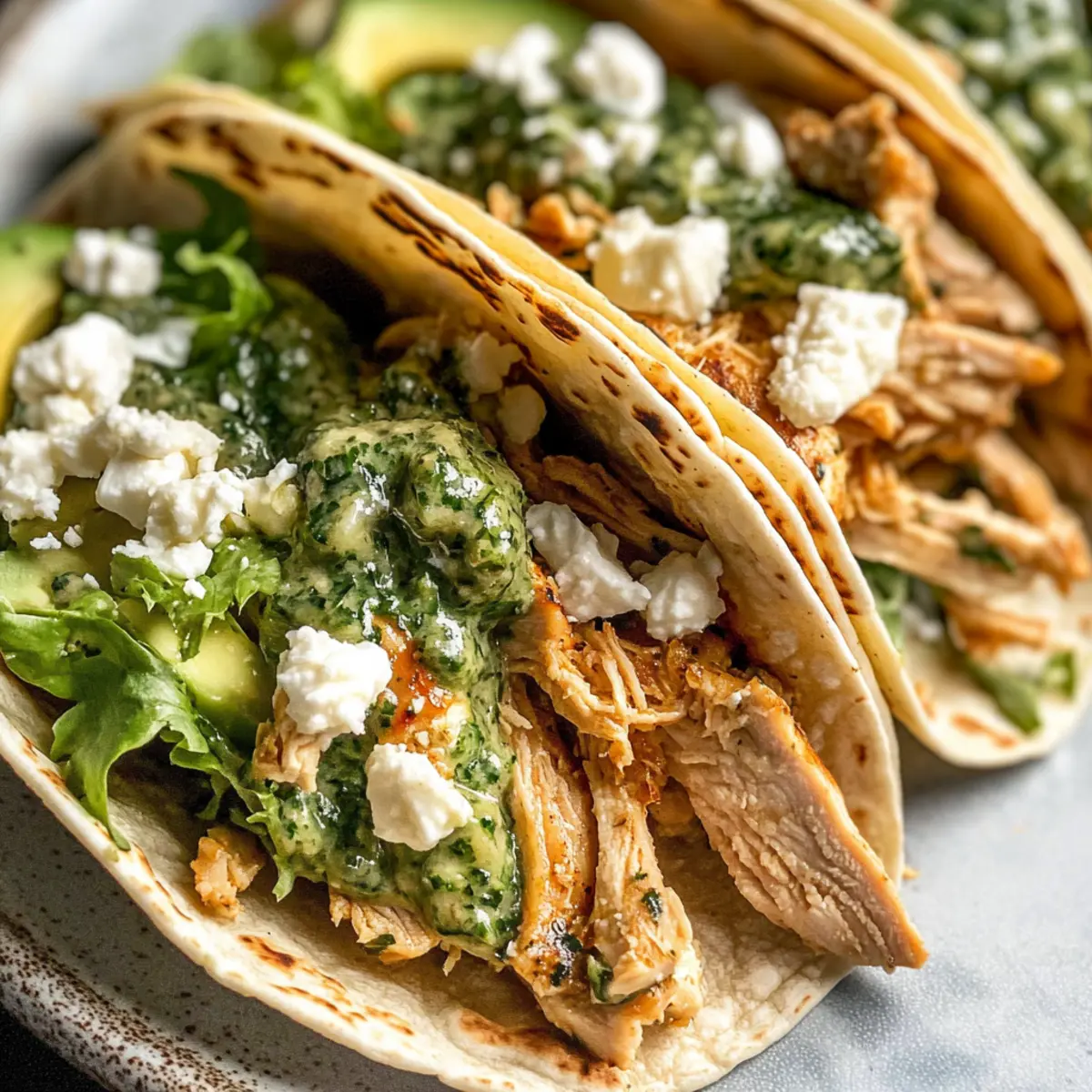 Erwärme die Tortillas in einer anderen Pfanne oder Mikrowelle, bis sie leicht geröstet und warm sind. Verteile die Hähnchenfüllung gleichmäßig auf den Tortillas und belege sie großzügig mit Romanasalat, Avocado und zerbröckeltem Feta. Träufle die cremige Chimichurri-Sauce darüber und serviere die Tacos warm für ein köstliches Abendessen.