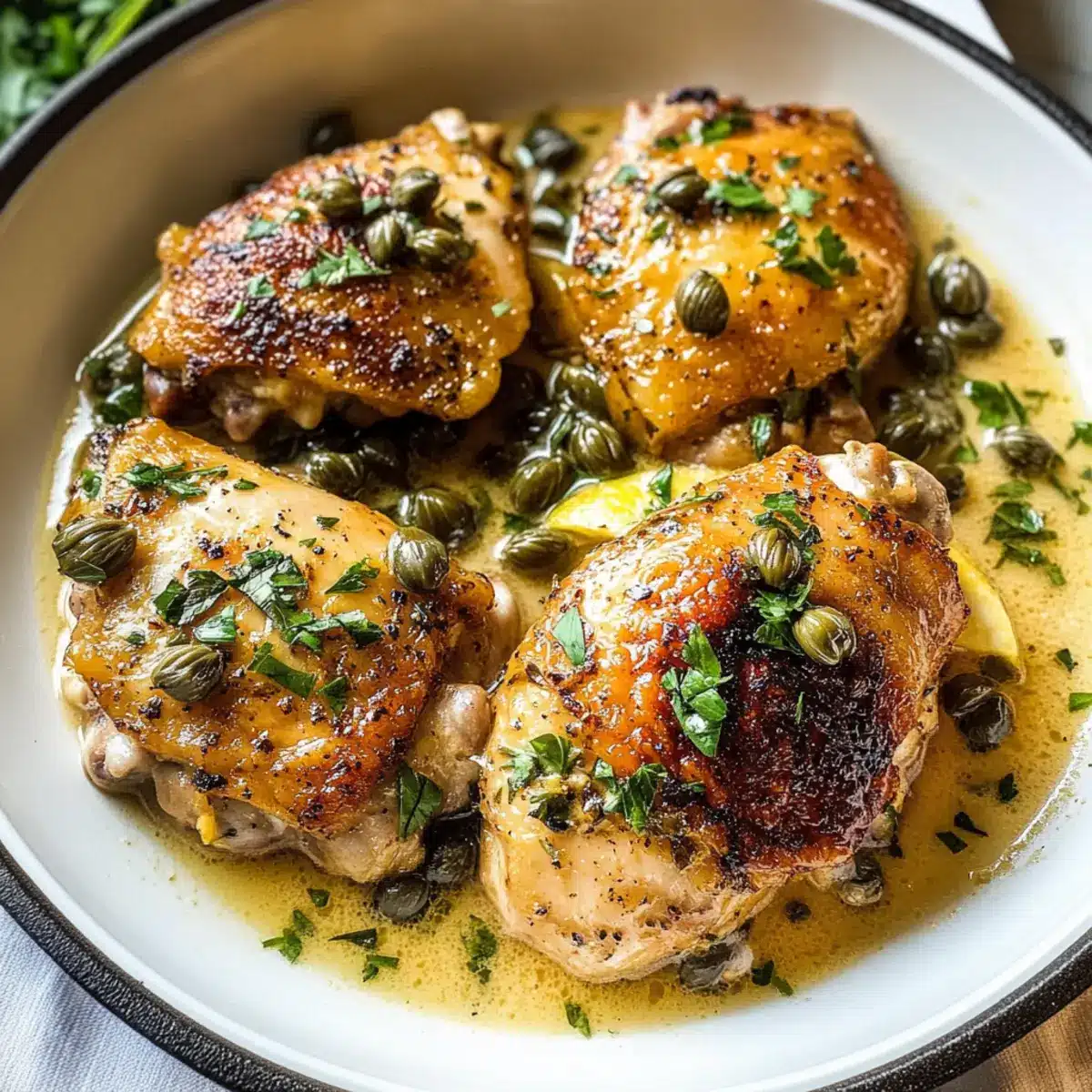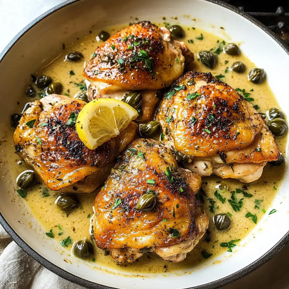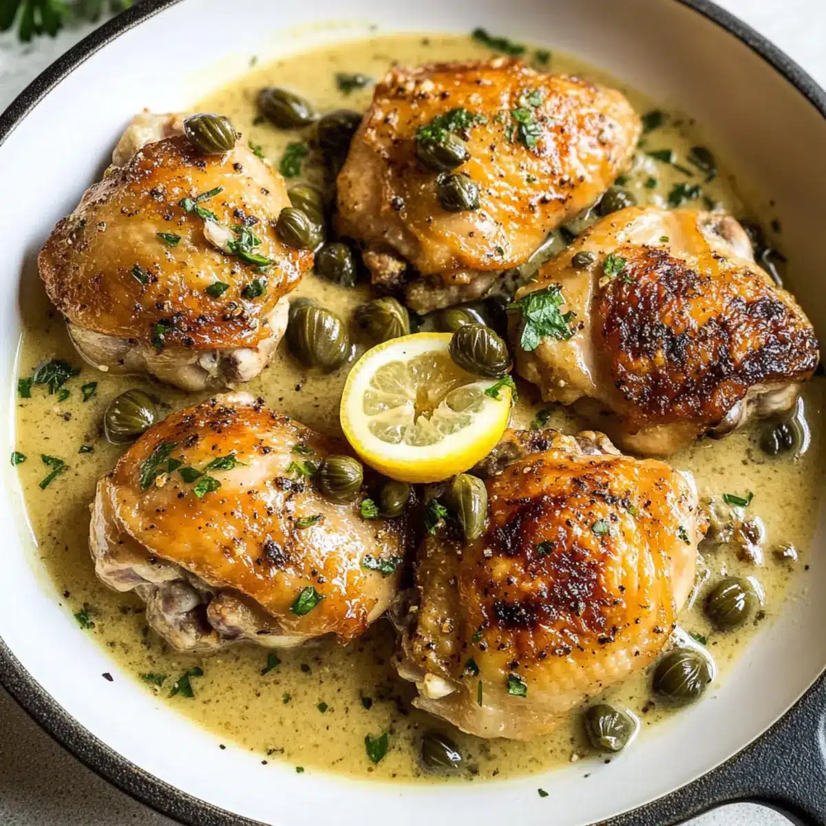 Füge die Kapern zur Sauce hinzu und lege die angebratenen Hähnchenschenkel wieder in die Pfanne. Löffele die Sauce großzügig über die Hähnchenschenkel, damit sie gut bedeckt sind. Decke die Pfanne ab und lasse das Gericht für etwa 15-20 Minuten bei niedriger Hitze köcheln, bis das Hähnchen durchgegart und die Sauce weiter eingedickt ist. Die Innentemperatur sollte mindestens 75°C (165°F) betragen.