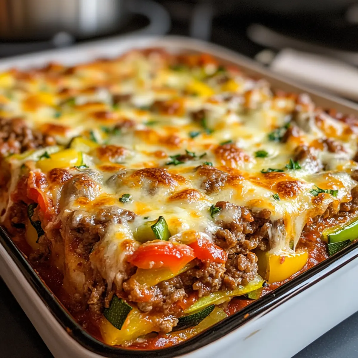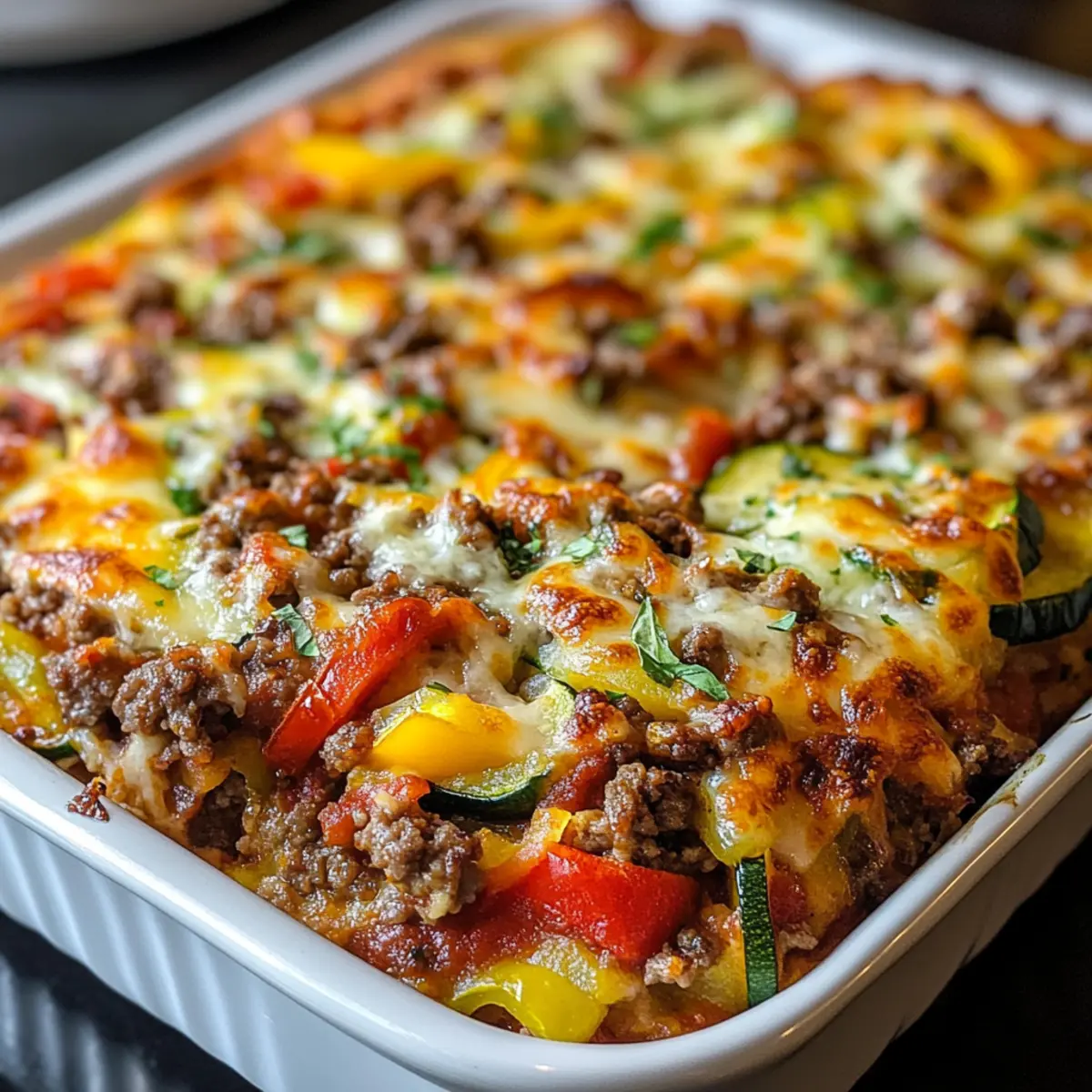 Gesunde Füllungen variieren: Du kannst das gemahlene Rindfleisch durch Hähnchen oder eine pflanzliche Alternative ersetzen, um den Zucchini Pizza Auflauf an deine Vorlieben anzupassen.