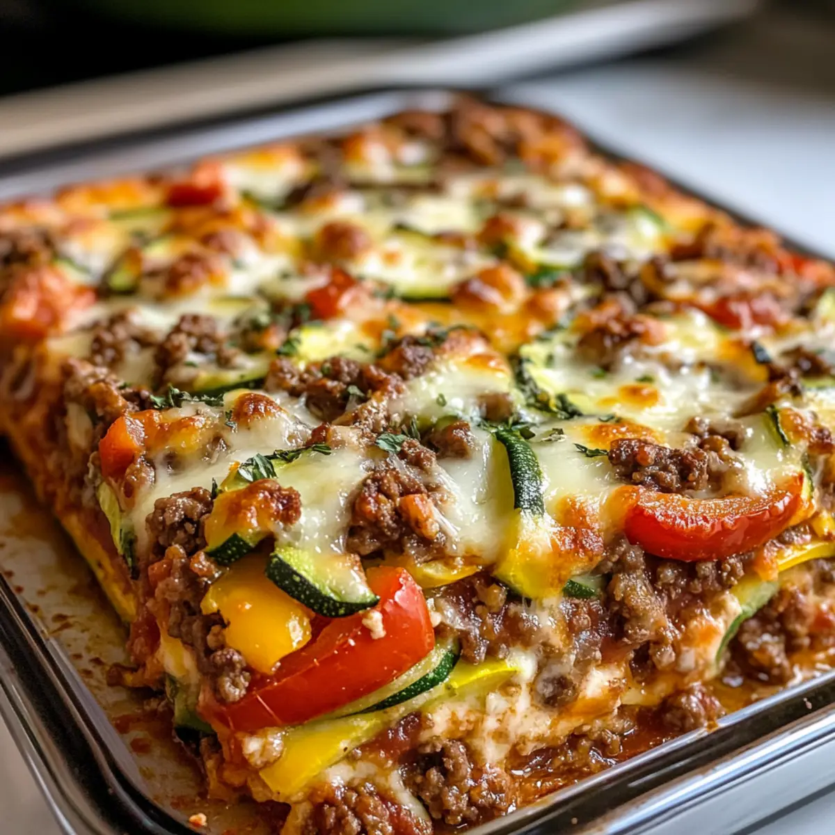 - Verteile die lecke Fleischmischung gleichmäßig über die gebackene Zucchini-Kruste.