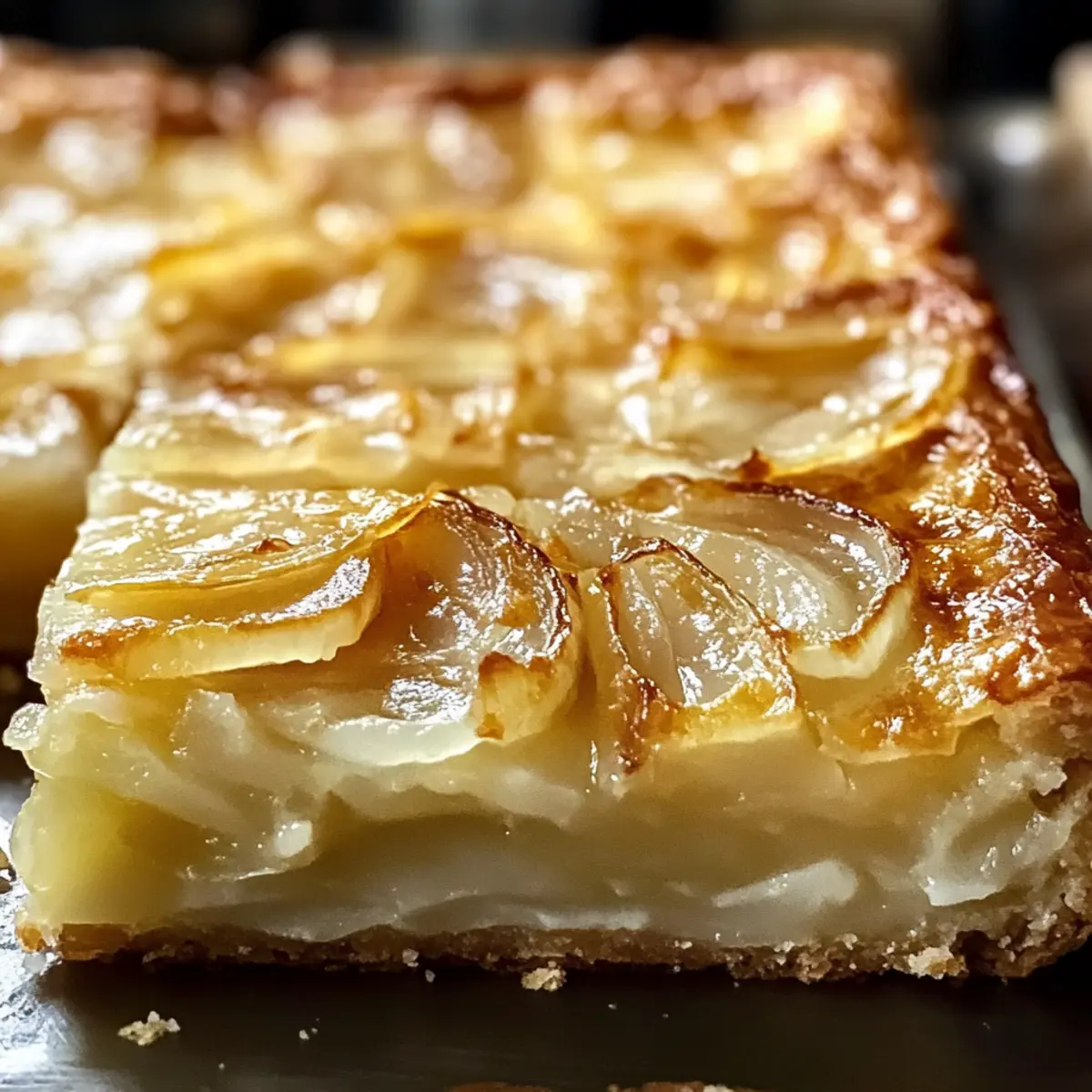Die Zwiebelmischung gleichmäßig über den abgekühlten Teig verteilen. Mit einem Spatel darauf achten, dass die Füllung gut verteilt ist. Dann die Backform für 25-30 Minuten in den Ofen zurückschieben, bis die Füllung fest und goldbraun ist. Überprüfe die Füllung mit einem Zahnstocher, um sicherzustellen, dass sie durchgebacken ist.
